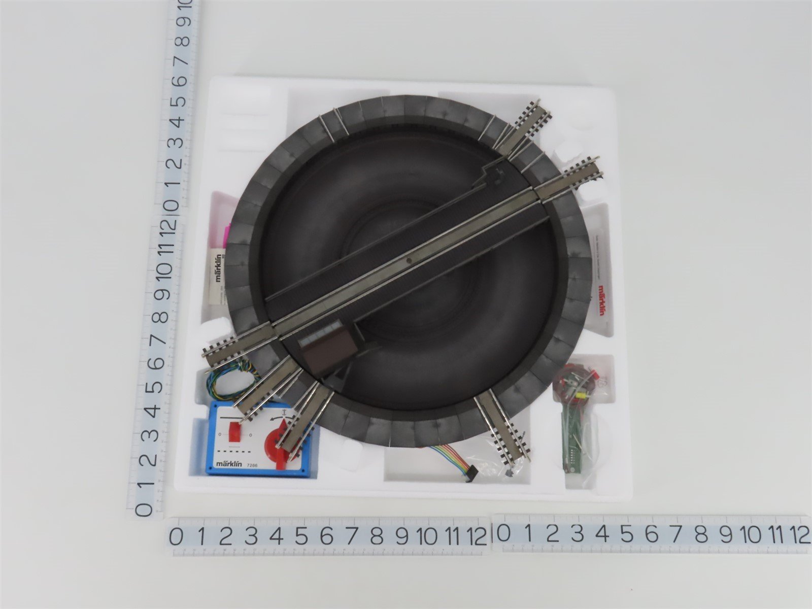 Function: The deck turns right/left in single steps and continuously to a stop. The turntable can be retrofitted with the 7687 digital set for easy digital control (sold separately). The turntable pit is designed for inset installation on a layout. 6 spoke tracks for K Track which can be installed at any spot on the perimeter of the turntable are included. The turntable can also be used with C Track and M Track in conjunction with adapter tracks. It can be expanded to a maximum of 48 spoke tracks at 7.5° intervals with the 7287 extension kit (sold separately). Track power to spoke tracks comes through the turntable deck. External diameter 386 mm / 15-3/16" (not including spoke tracks). Deck length 310 mm / 12-1/4". The turntable can be used with the 7288/72881 locomotive shed (sold separately).