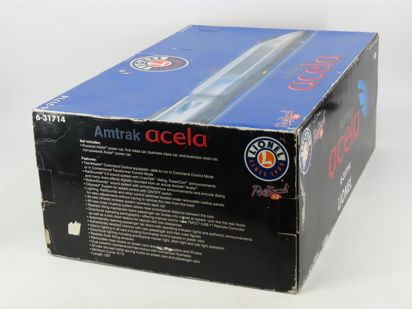 Traction tires missing. Some replacements included, but not installed - Automatic passenger doors don't work consistently. One of them is stuck open (common issue with Lionel's Acela) - Some scuff marks and other general signs of wear - Both end units accept an optional 9V battery (not included) - Set box is damaged, individual boxes also have minor damage